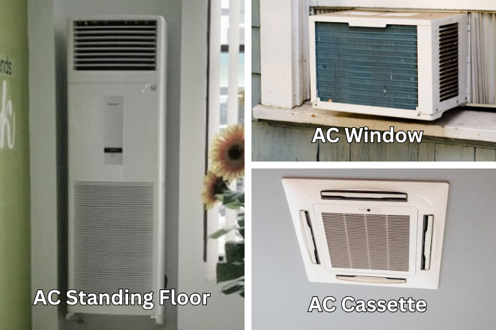 Tidak semua jenis AC cocok digunakan untuk rumah kost. AC window merupakan model lama yang cenderung lebih bising dan memiliki pilihan kapasitas terbatas. AC standing floor membutuhkan ruang yang lebih besar dan konsumsi listriknya relatif tinggi. Sementara itu, AC cassette dan AC central umumnya digunakan untuk hotel, perkantoran, atau gedung komersial karena biaya instalasi serta perawatannya cukup mahal.